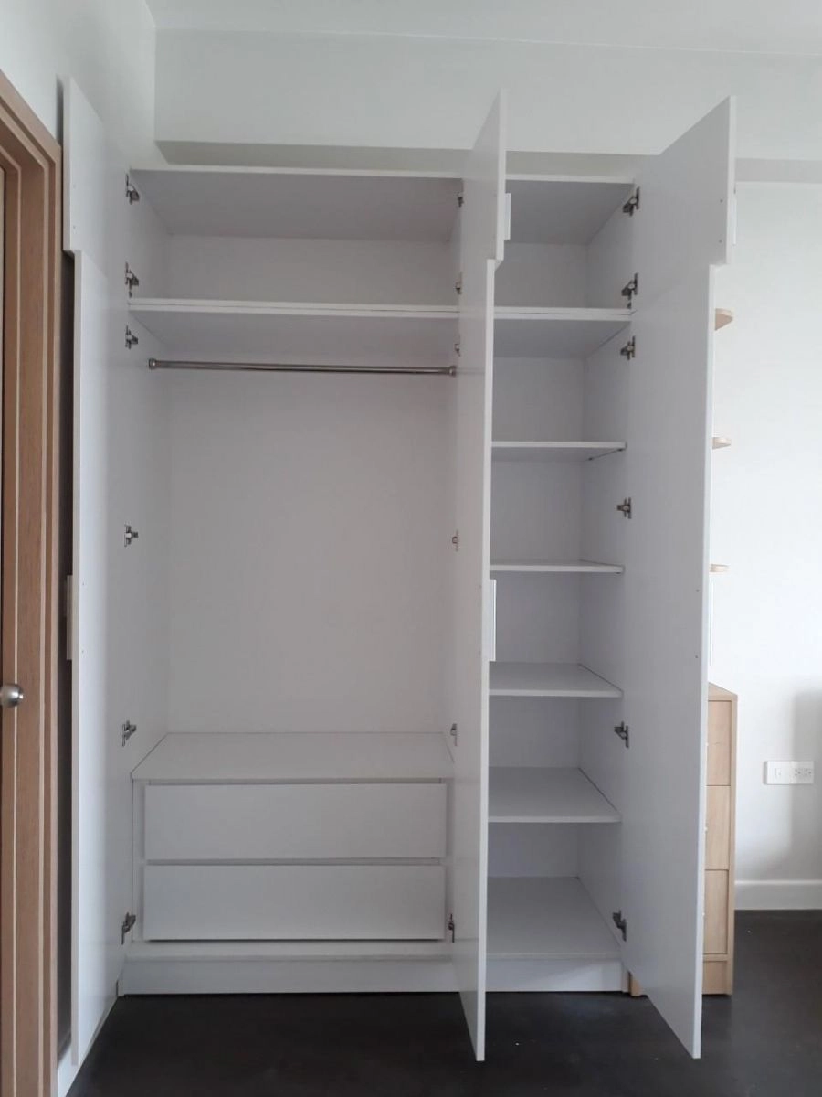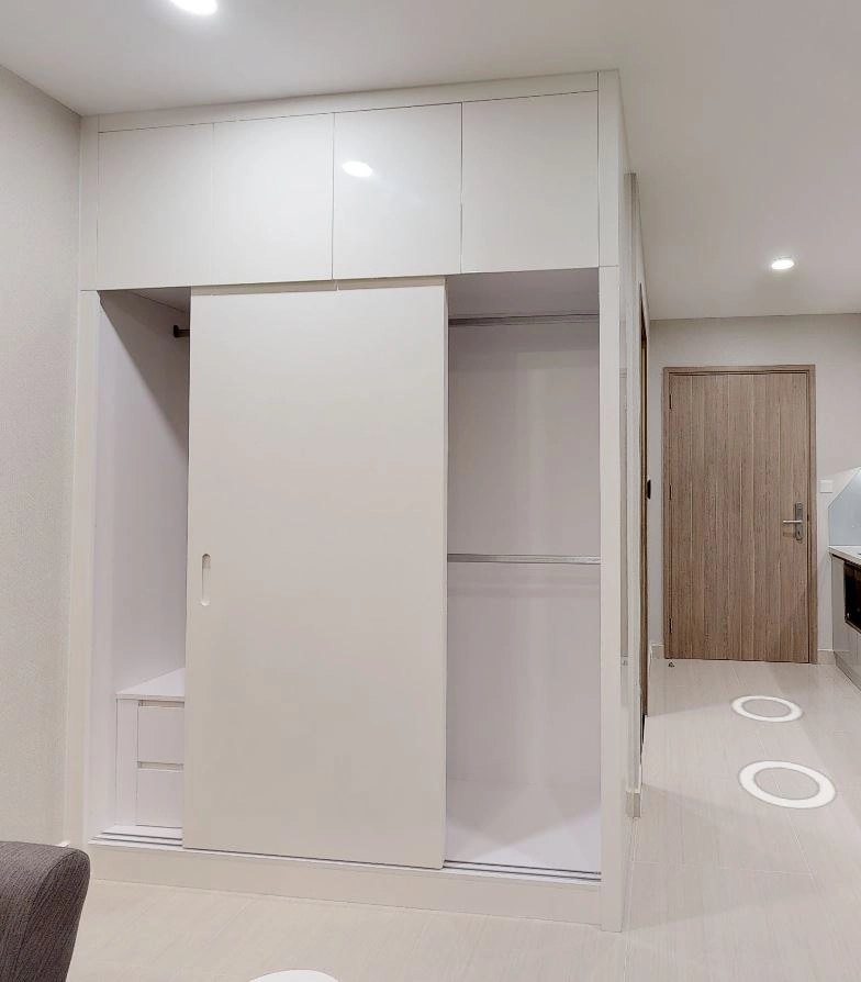Phụ kiện tủ có sẳn : Cây treo quần áo, ray trượt, lề hơi giảm chấn, tay nắm mặc định, 3 hộc kéo.