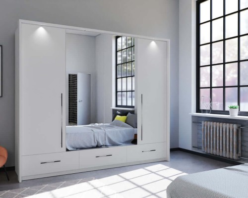 Phụ kiện có sẵn : Cây treo quần áo, ray trượt, lề hơi giảm chấn, tay nắm mặc định, 3 hộc kéo