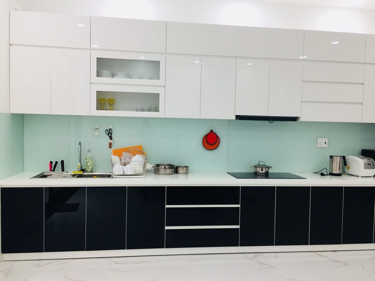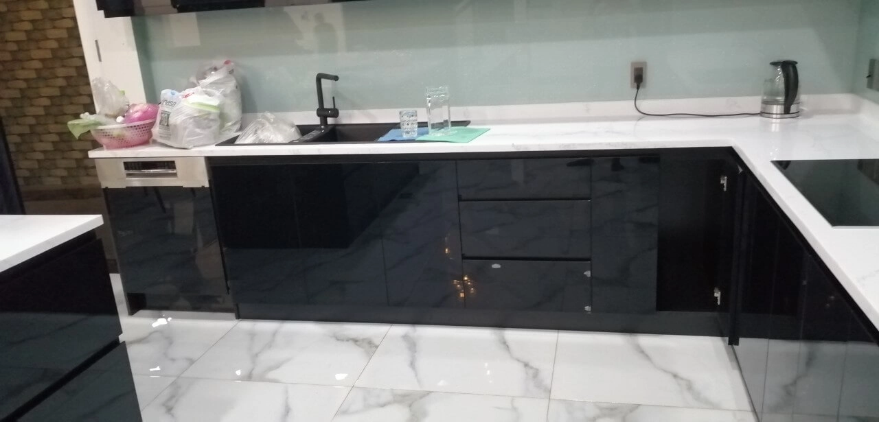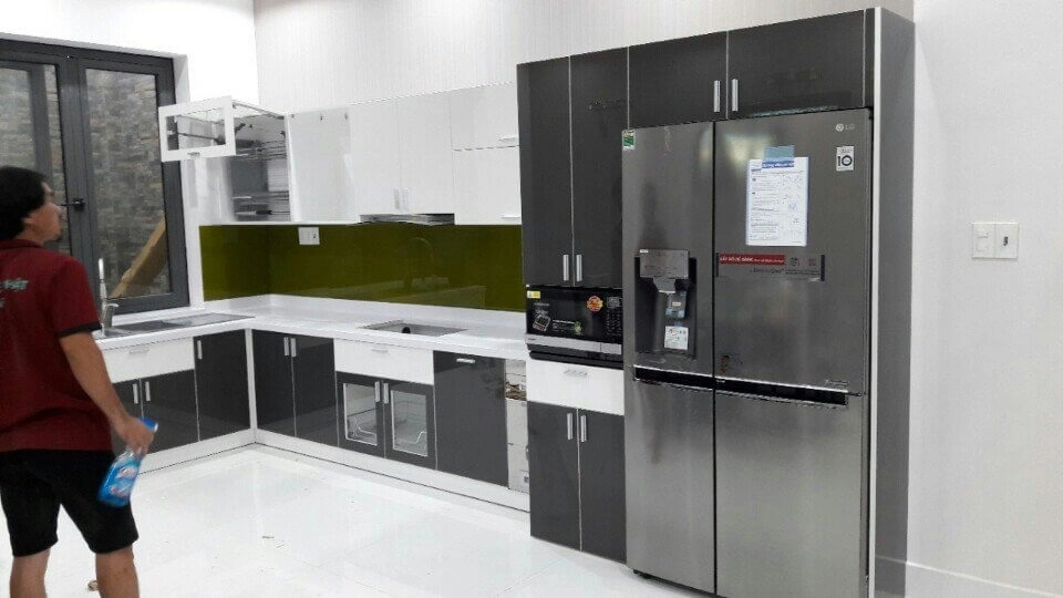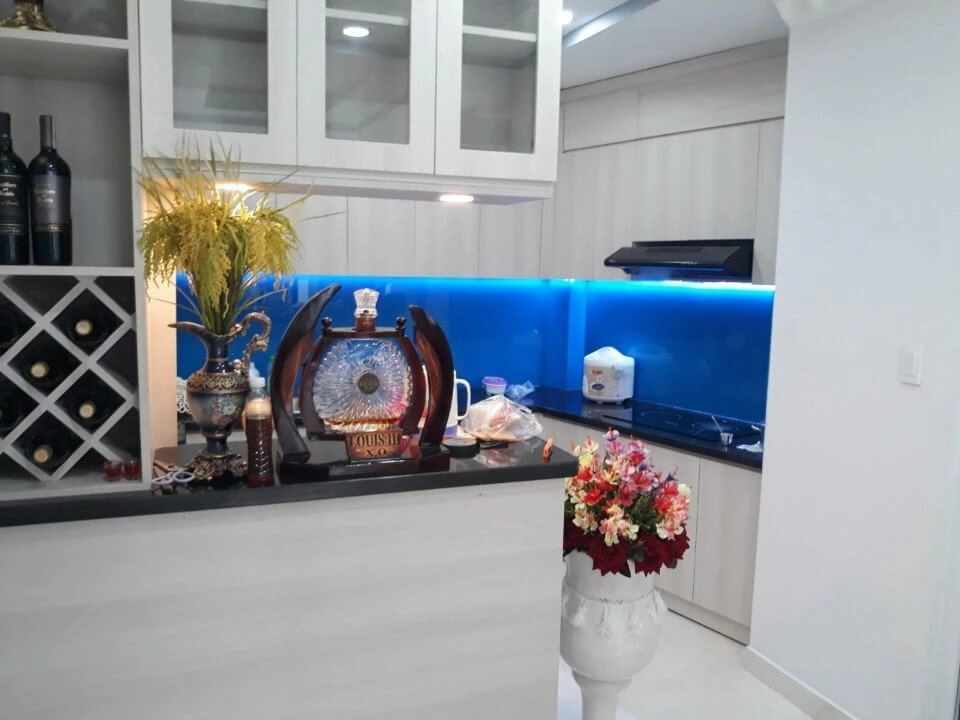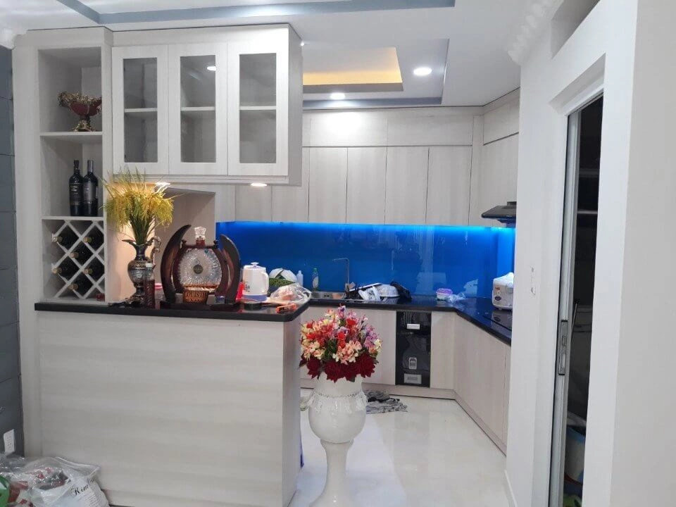 Kính ốp bếp : 1.200.000đ/md (Kính cường lực ốp bếp loại 8mm, Sơn màu theo yêu cầu)