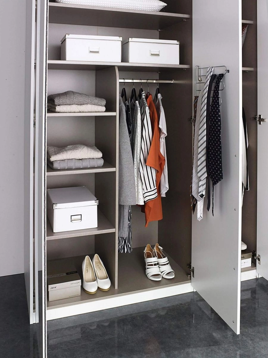 Phụ kiện có sẵn : Cây treo quần áo, ray trượt, lề hơi giảm chấn, tay nắm mặc định, 3 hộc kéo