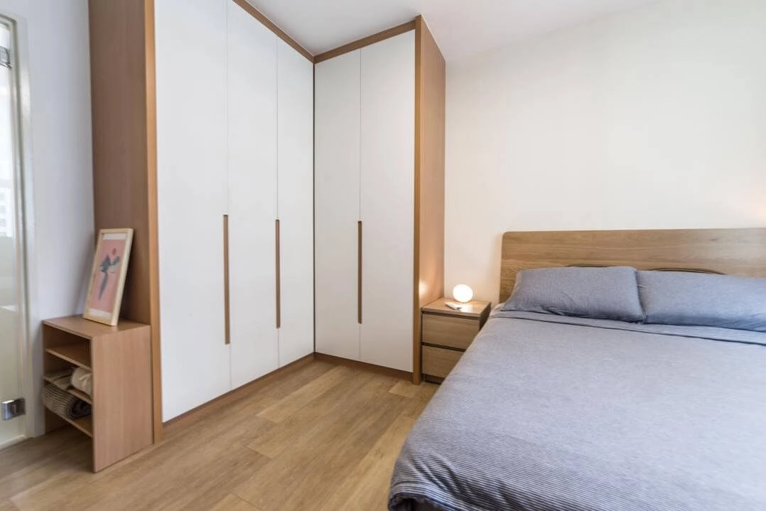 Phụ kiện có sẵn: Cây treo quần áo, ray trượt, lề hơi giảm chấn, tay nắm mặc định, 3 hộc kéo