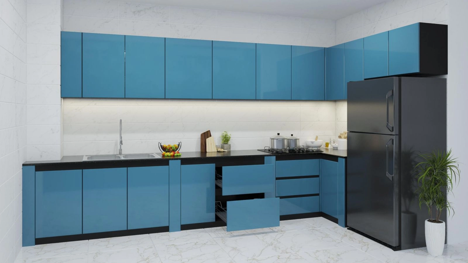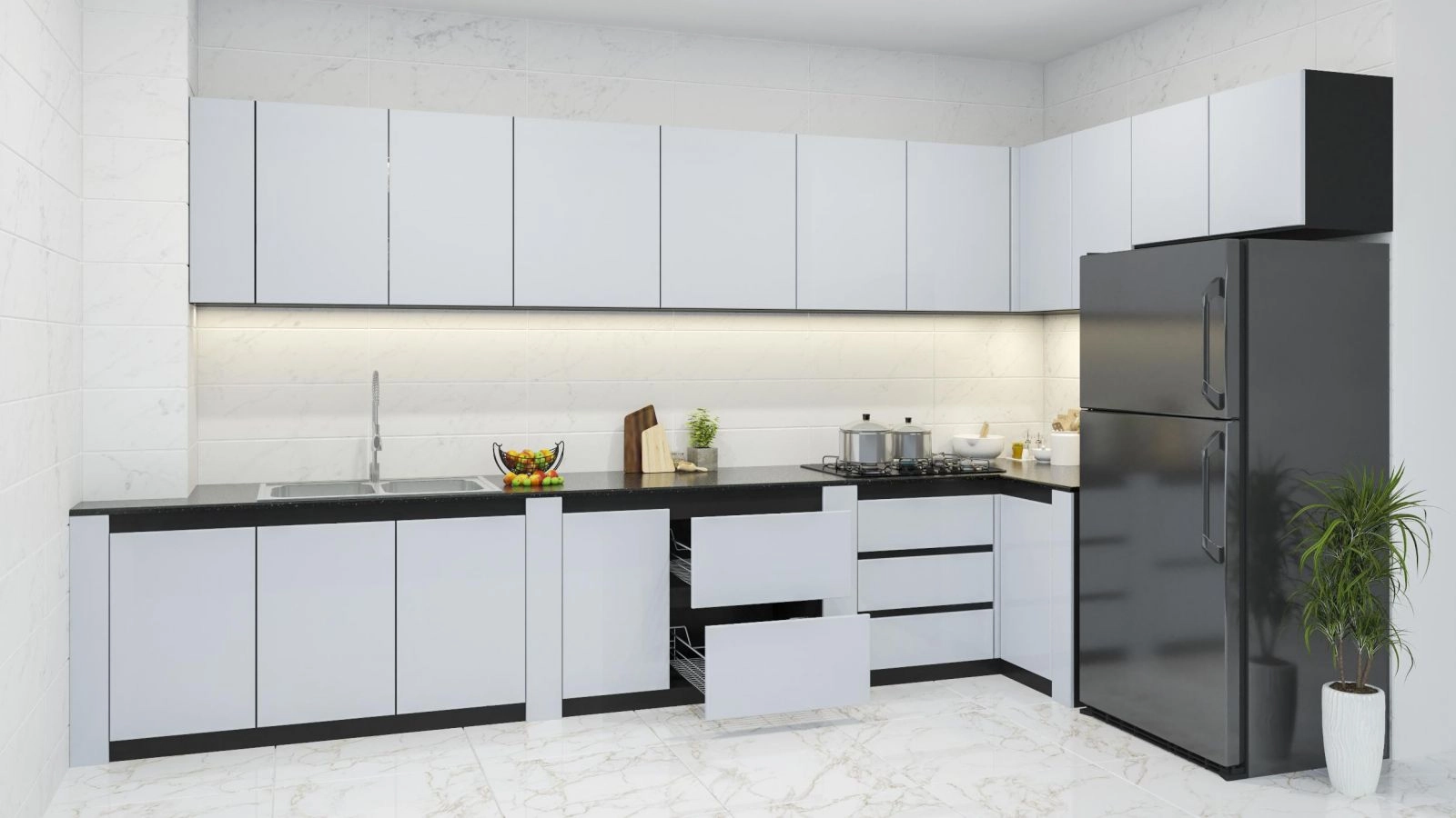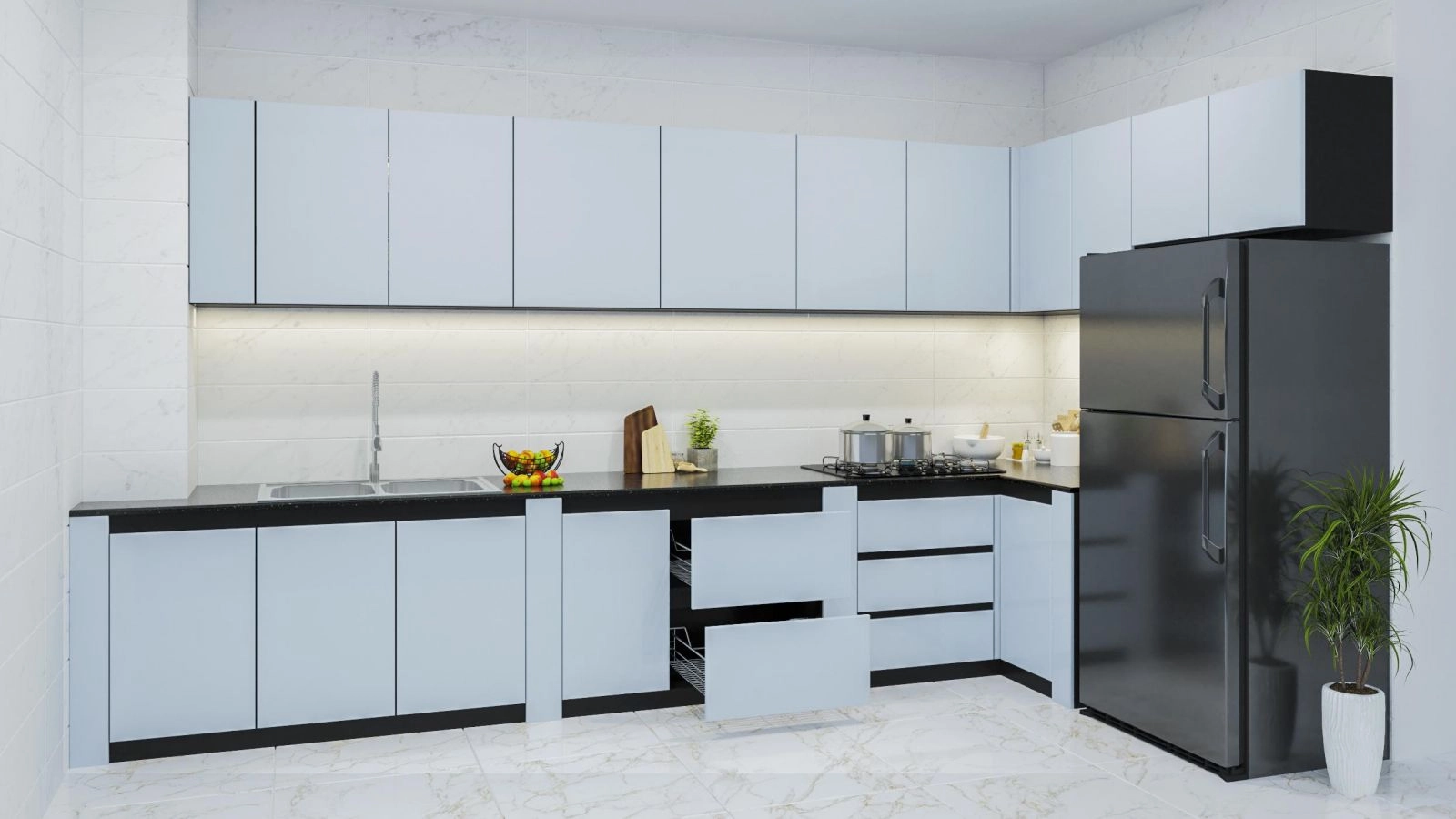 Phụ kiện bếp : Ray trượt, Lề hơi giảm chấn, Tay nắm mặc định, 3 hộc kéo.