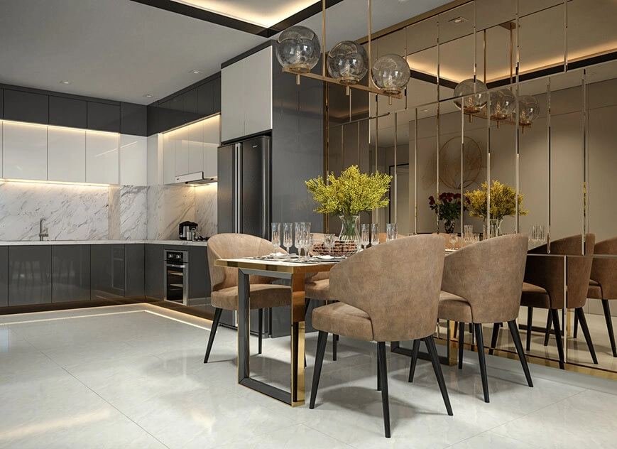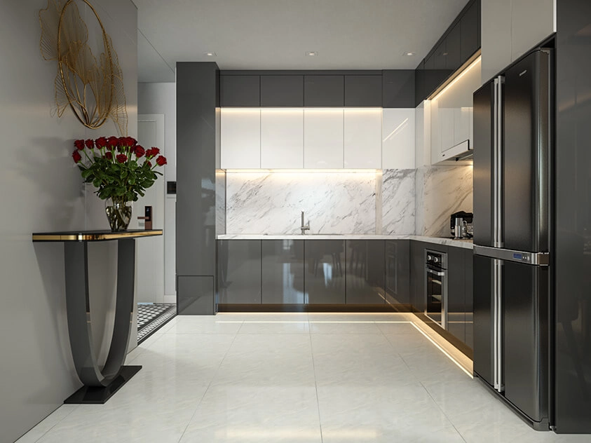 Mỗi căn nhà đều có kết cấu và kích thước khác nhau. Thiết kế và thi công tủ bếp nhằm tạo nên một không gian có sự hài hòa về tổng thể, bố cục, màu sắc, ánh sáng và có công năng sử dụng cao nhất cho không gian bếp. Mẫu Tủ Bếp Gỗ được phủ Acrylic có bề mặt bóng nhẵn như gương tạo chiều sâu cho những căn nhà có không gian nhỏ.