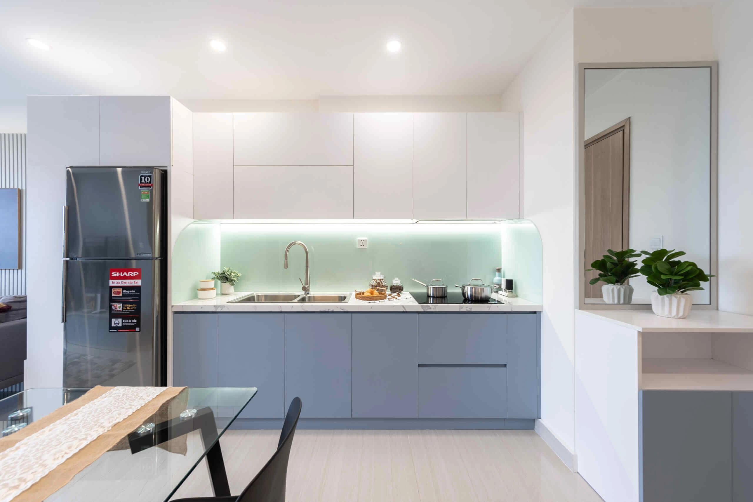 Kính ốp bếp : 1.200.000đ/md (Kính cường lực ốp bếp loại 8mm, Sơn màu theo yêu cầu)