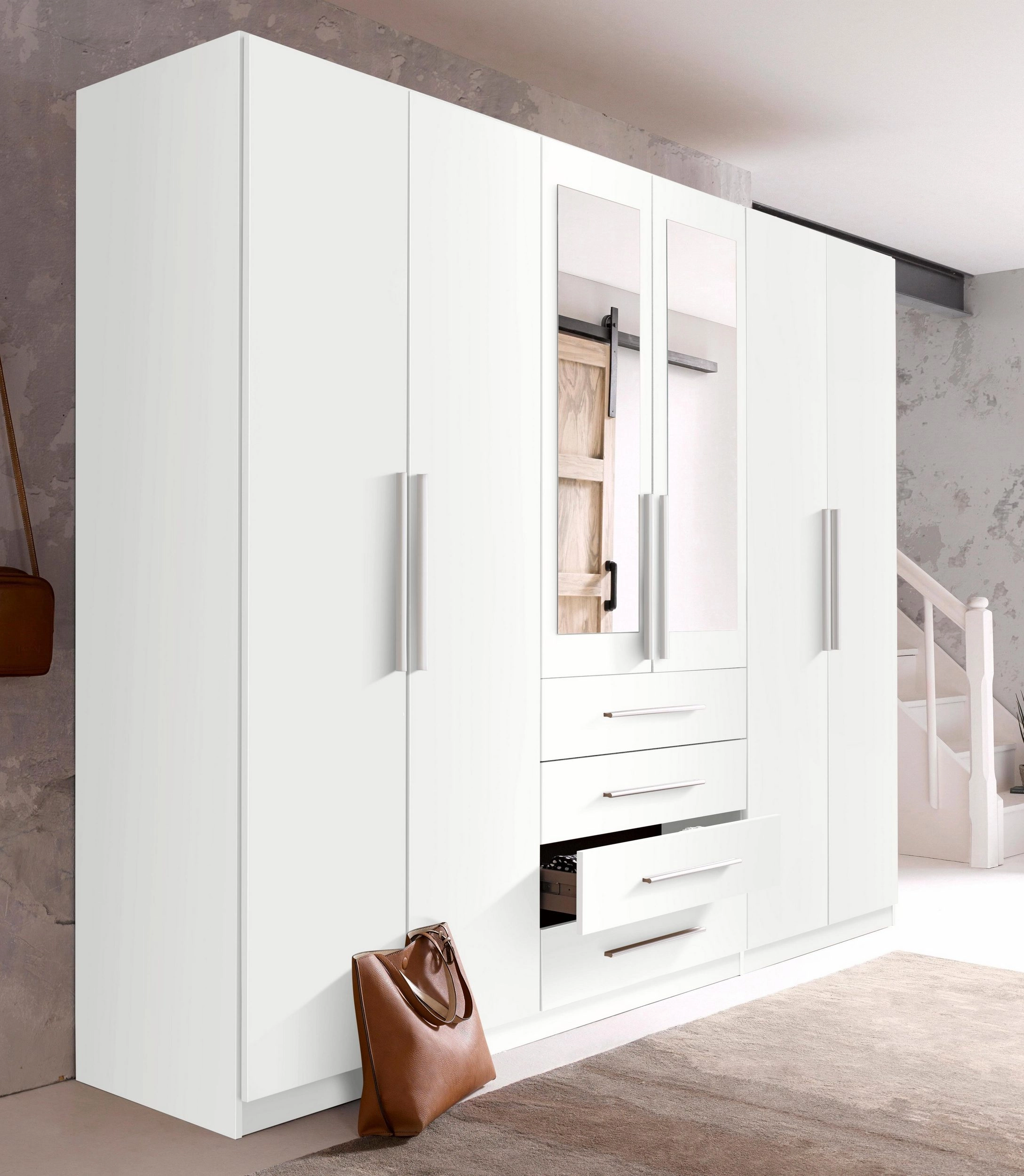 Phụ kiện có sẵn : Cây treo quần áo, ray trượt, lề hơi giảm chấn, tay nắm mặc định, 3 hộc kéo