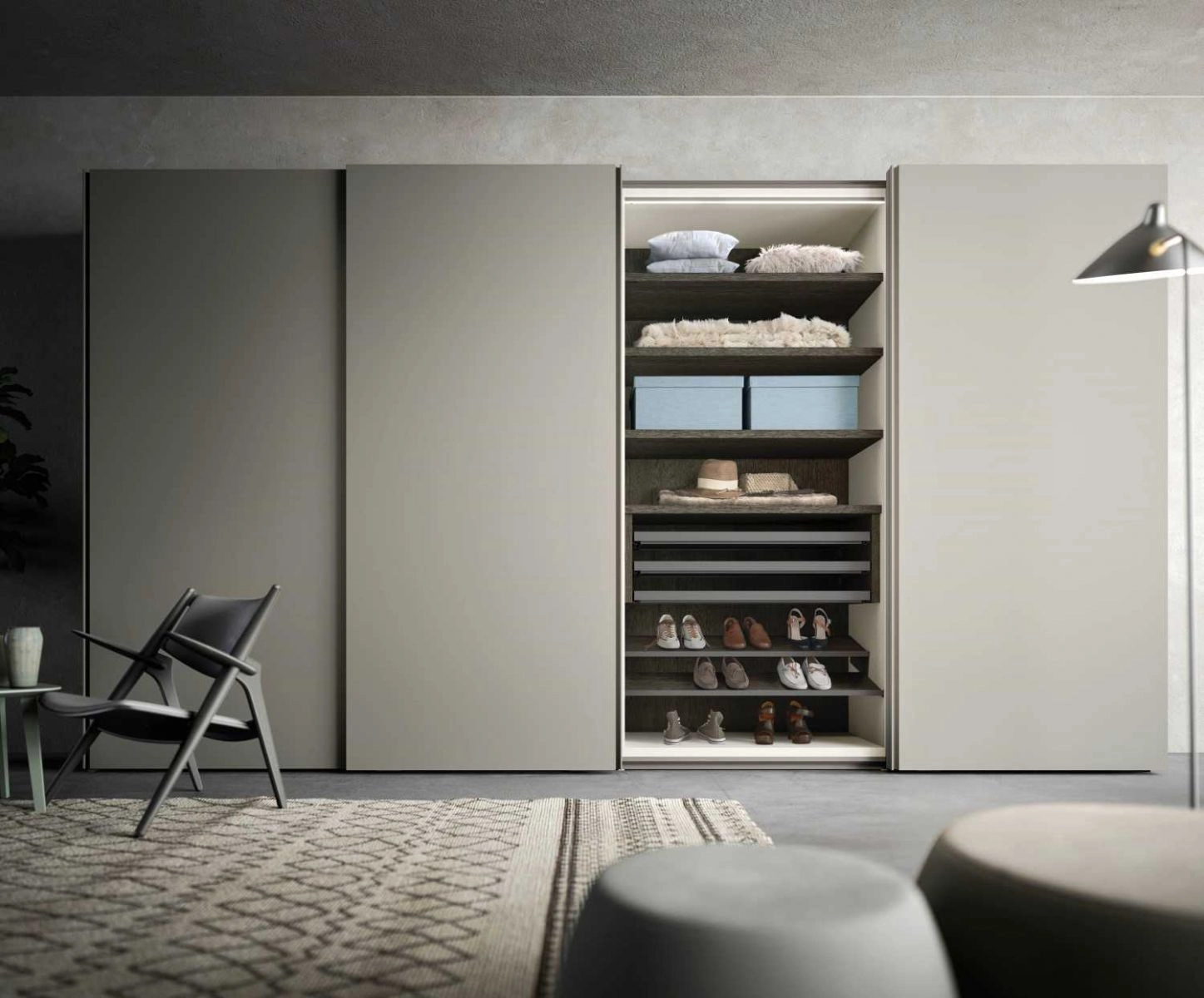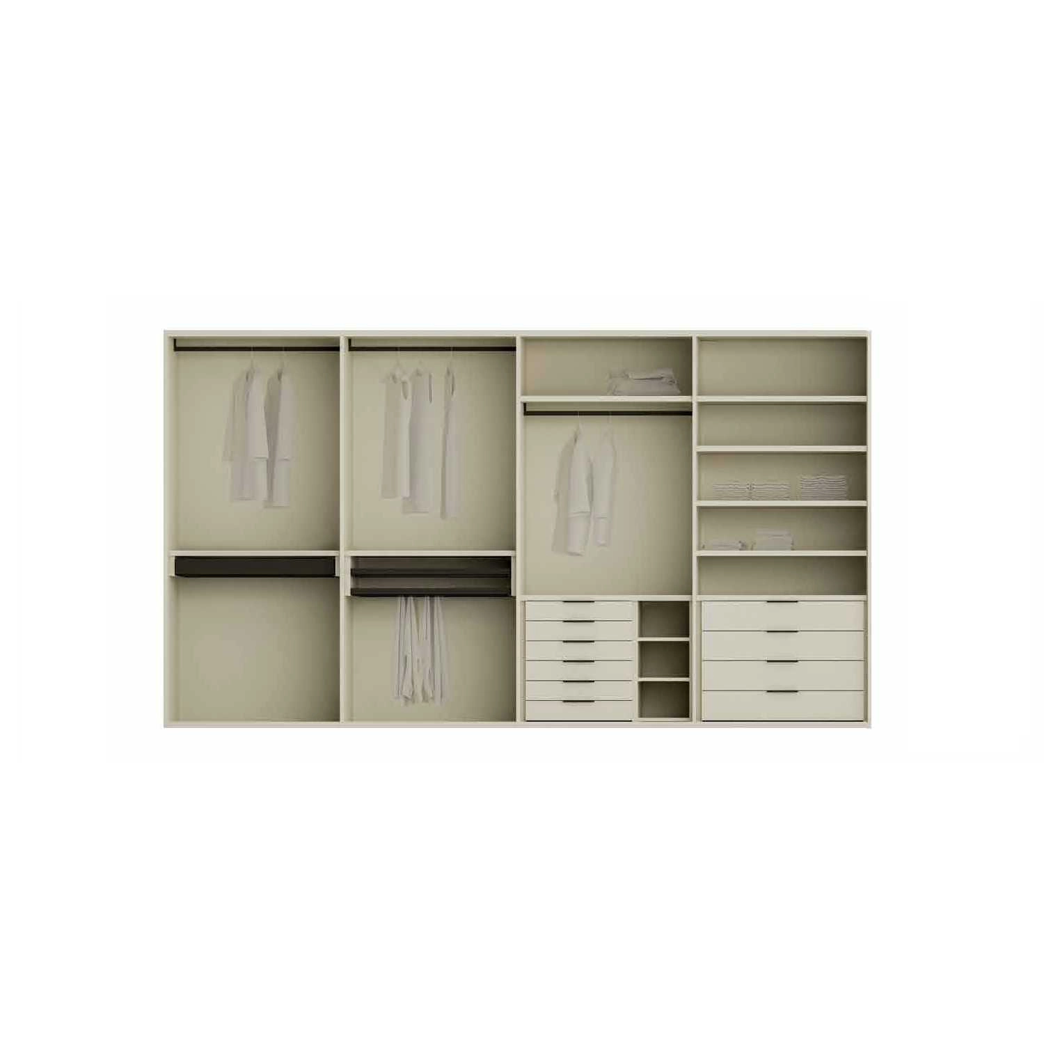 Phụ kiện có sẵn: Cây treo quần áo, ray trượt, lề hơi giảm chấn, tay nắm mặc định, 3 hộc kéo