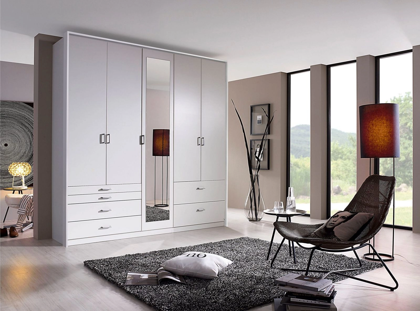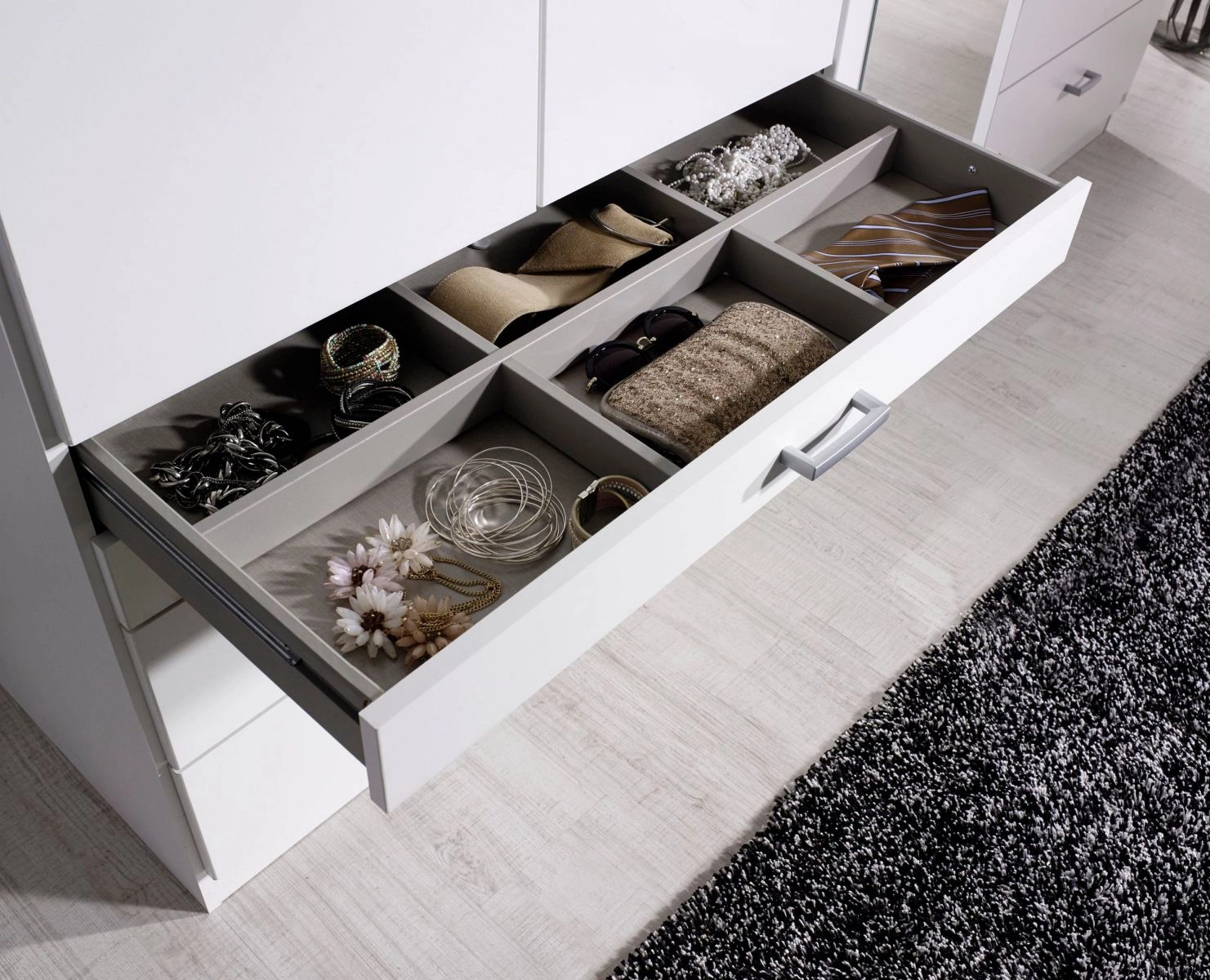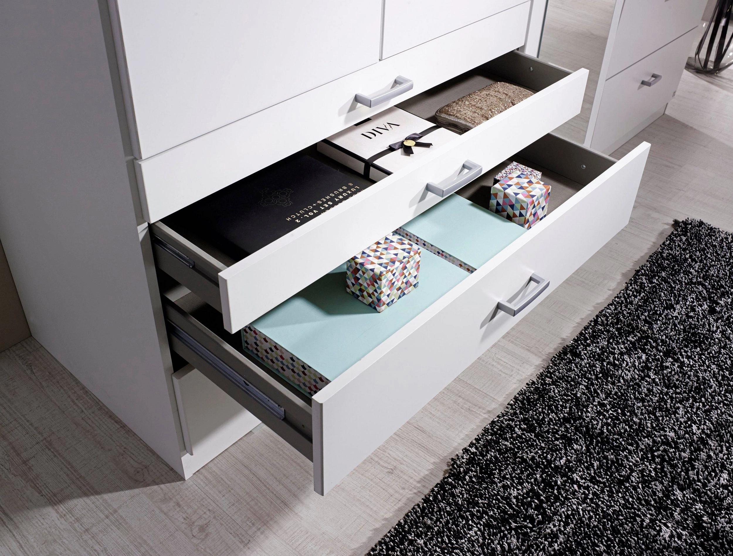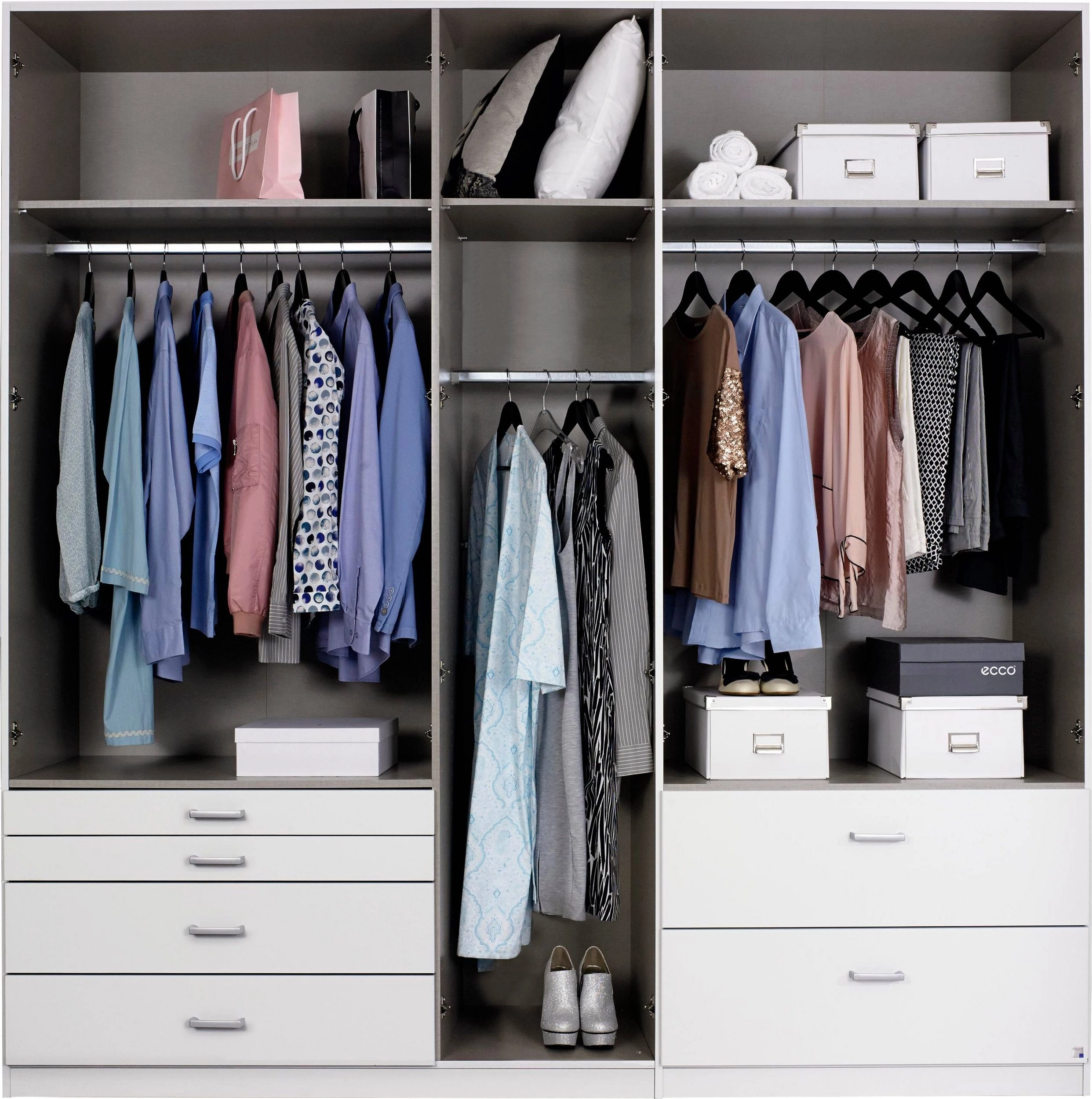 Phụ kiện có sẵn : Cây treo quần áo, ray trượt, lề hơi giảm chấn, tay nắm mặc định, 3 hộc kéo